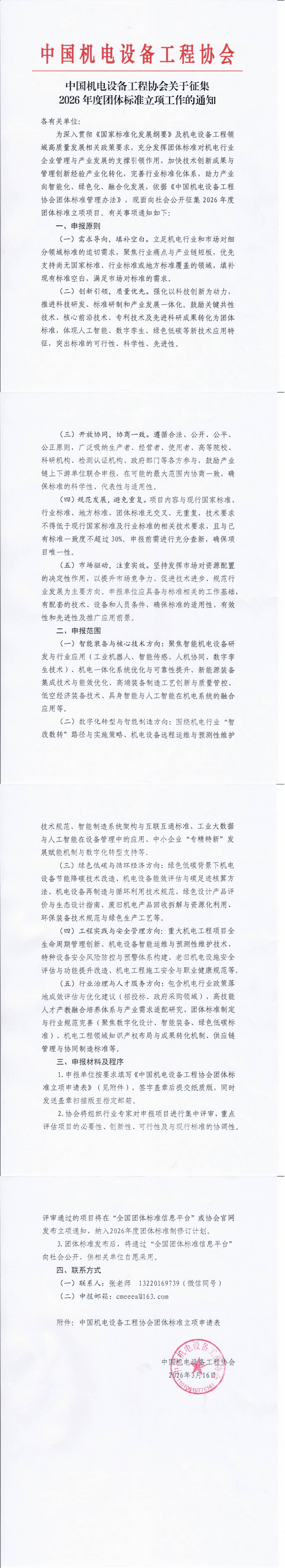 中国机电设备工程协会关于征集2026年度团体标准立项工作的通知